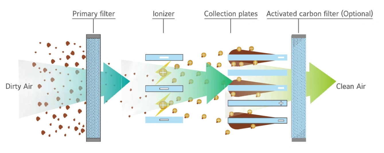 The TRION® T-Series utilizes the principle of Electrostatic Precipitation. Air is drawn by the motor/blower through a washable metal mesh pre-filter which traps large dust particles. The remaining particles, some as small as 0.01 microns, pass into a strong electrical field (ionizing section) where the particulate receives an electrical charge. The charged particles then pass into a collector plate section made up of a series of equally spaced parallel plates. Each alternate plate is charged with the same polarity as the particles, which repel, while the interleaving plates are grounded, which attract and collect.