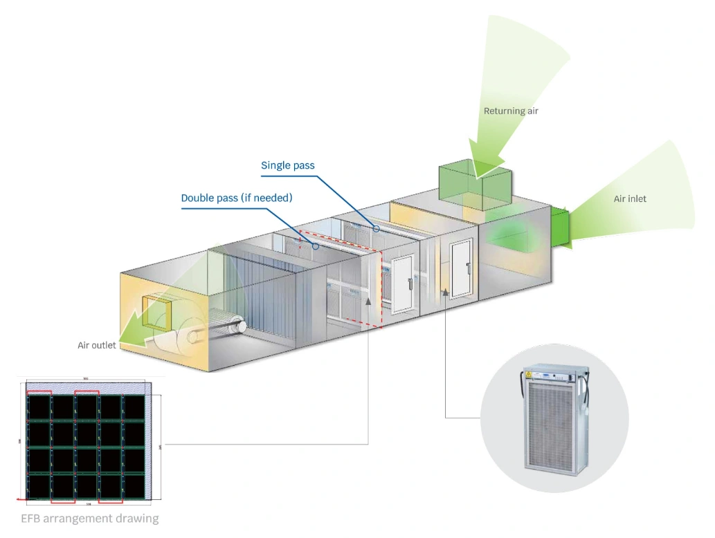 The EFB works in tandem with the air handling unit (AHU) to purify returning air into fresh, clean air. This process provides a variety of purification solutions, depending on specific requirements. You are then guaranteed cost-effective and highly efficient air purification.